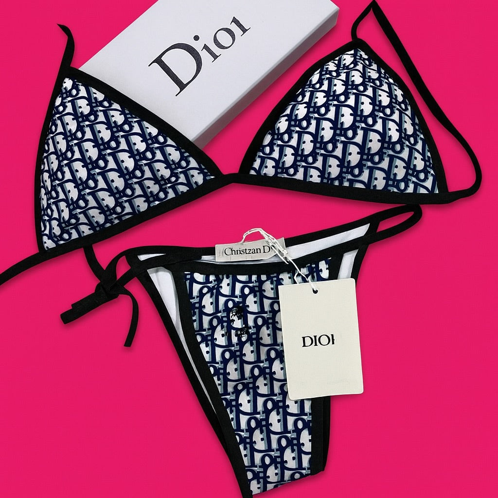 Make waves with this striking two-piece featuring a repeating navy icon pattern and sleek black borders. Designed for style, comfort, and confidence, it’s your go-to for a polished summer look.