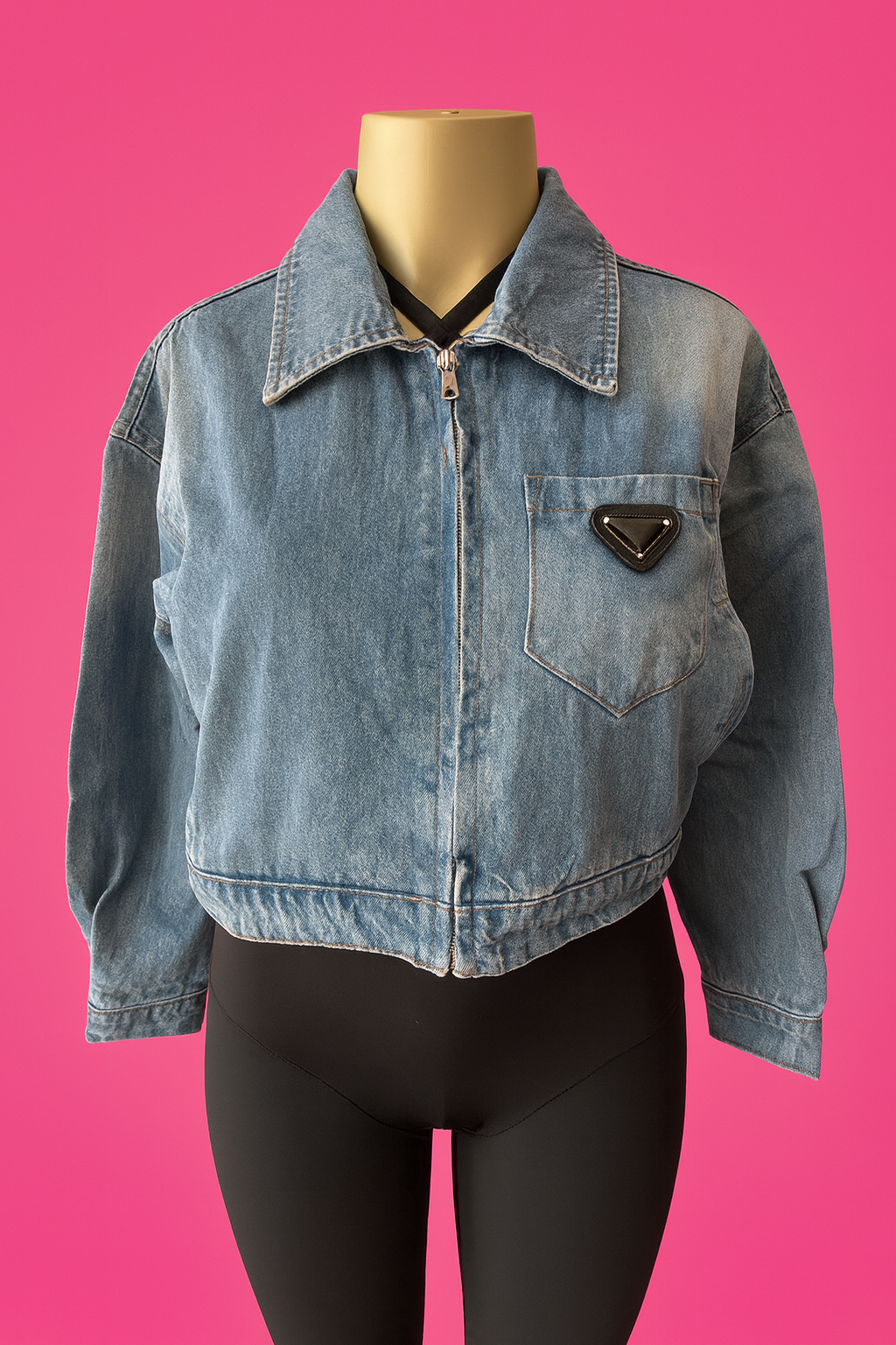 Bring high-fashion edge to your everyday look with this designer cropped jacket. Crafted in a classic light-wash finish, it features a structured collar, front zip closure, and a chest pocket accented with a sleek triangular designer emblem. The slightly oversized fit with dropped shoulders makes it effortlessly stylish, blending laid-back comfort with luxe detail.