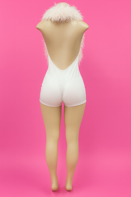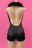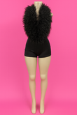 Turn heads with our Frost & Flame Romper , a daring mix of glam and playful chic. Featuring a plush faux-fur neckline that drapes dramatically down the front, this romper balances softness with sleek fitted shorts for a statement-making silhouette.