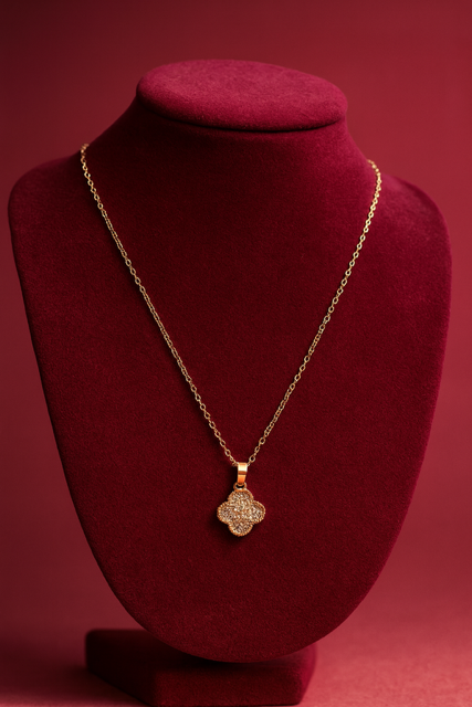 Radiating elegance, the Golden Clover Spark Pendant. Perfect for adding a subtle touch of glamour, this versatile piece transitions effortlessly from day to night.