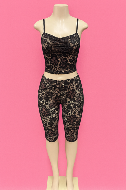A stunning two-piece featuring delicate floral lace layered over a nude base, designed with a fitted cami and cropped lace leggings. Perfect for turning heads with effortless elegance.