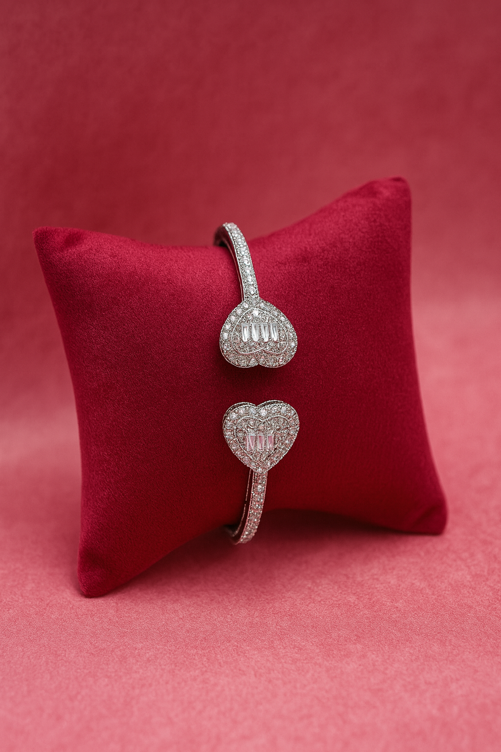 This elegant bracelet features an open-band design, crafted in polished stainless steel with sparkling round-cut diamonds along its length. At each end, two dazzling heart-shaped motifs each outlined with a halo of pavé-set diamonds and accented with three vertical baguette-cut stones for a modern, luxurious touch.
