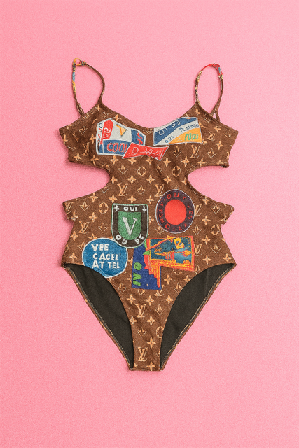 A bold and cheeky one-piece swimsuit featuring classic monogram prints, jazzed up with colorful travel patch graphics. It’s part luxury, part adventure-ready.