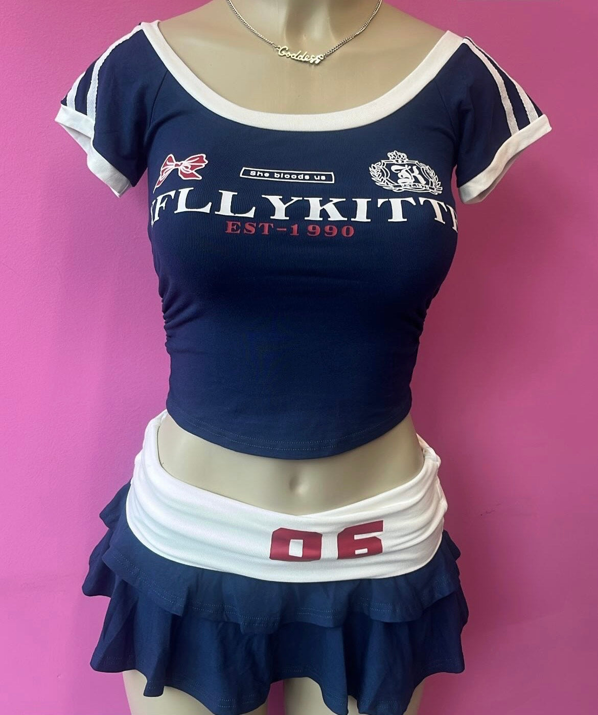 Bring the heat in this ultra-cute, retro-inspired two-piece set. Featuring a fitted navy crop top with sporty stripes. The matching mini skirt with ruffle layers and a contrast waistband gives flirty-meets-fierce vibes that turn heads on the block.